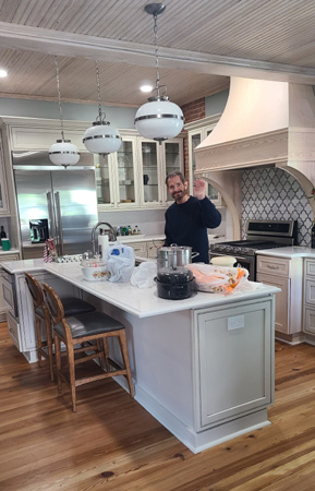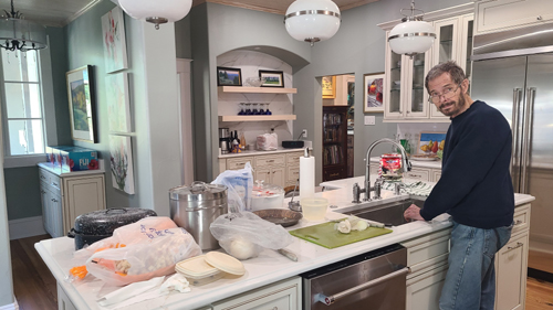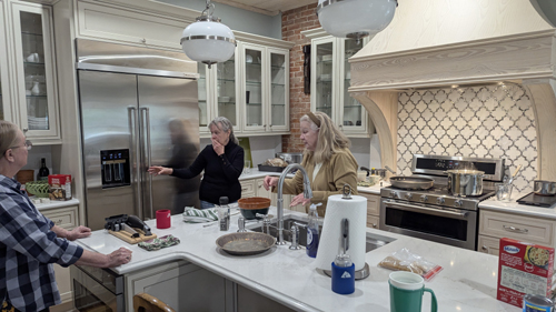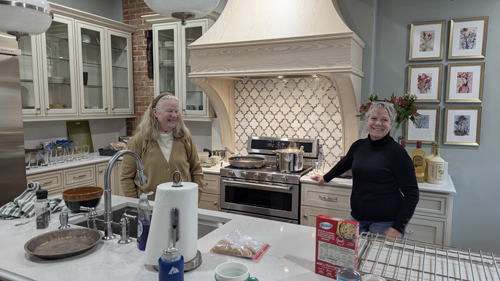 The project encountered more than its share of difficulties. It was discovered that to support the new kitchen, new footers had to be installed, and they had to run down through the basement and into the ground. The floor was found to be in even worse shape than had been thought, and entirely reworking them caused more delays. There were plumbing and electrical issues to deal with as well- not surprising when you consider the house is 125 years old. While the rest of the house had been updated when it was made into a bed and breakfast in 2000, the kitchen had been serviceable. But now, all these chickens came home to roost and there was no way that the kitchen would be finished for Thanksgiving, 2024, which is why we did not come down that year. In fact, the Ruckmans were without a functioning kitchen for more than a year- from late summer 2024 until late summer 2025. I would have been unable to deal with that, but since Prudence and Ron eat out almost all the time, they didn't need much more than the fridge that was moved to the dining room.