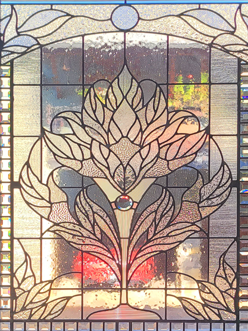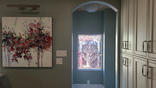 The new kitchen layout has also given Prudence more wall space on which she can hang more of the large collection of artwork that she has. The back door is just to the left of the new stained-glass window that looks out to the back of the house.