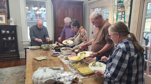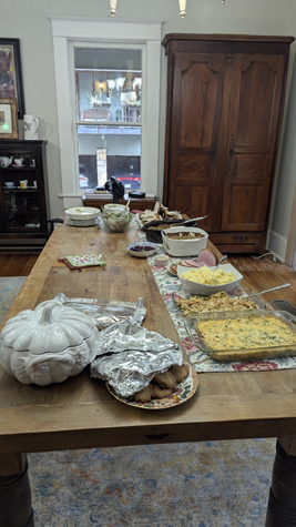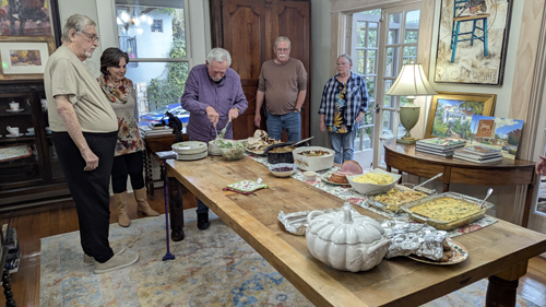 Ron makes a salad, and Prudence makes some of the best mashed potatoes you've ever tasted, and Nancy brings a vegetable dish or two, so we have quite a spread, which gets laid on on the dining room table where Karl carves his turkey. Then the dinner is buffet-style and we eat in the sunroom.
