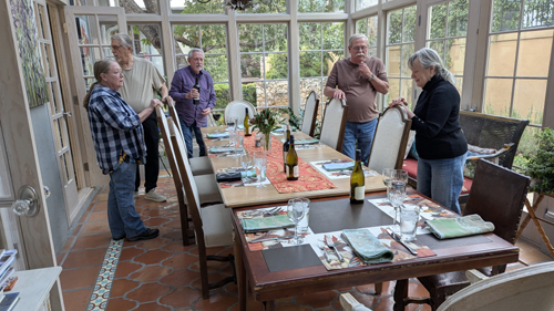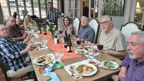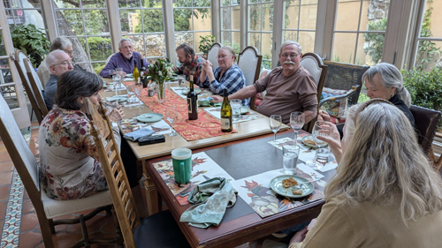 In that beautiful glass room, Prudence can use her big table and a smaller one easily accommodate a dozen people, although this year there were just ten of us: Prudence and Ron, Nancy and Karl, Fred and me, Kim and John, Susan Riley (one of Prudence's artists who does the photo embellishments), and Mike (a very good friend of Ron's).