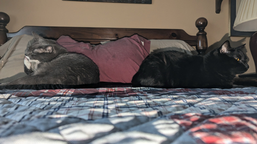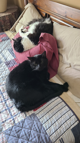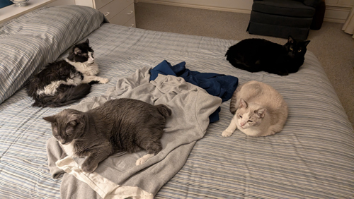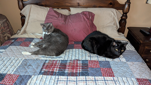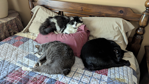 Here are some additional pictures of the cats on the guest room bed, taken over the next few days: