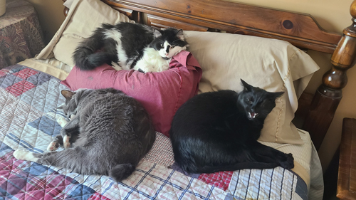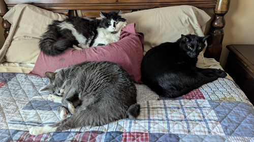 I suppose anyone who lives with a cat knows that they have their "spots" where they feel comfortable and like to relax. For our cats, one of those spots is on the bed in the guest room. It is always heart-warming to see the cats snuggling up together, or at least quite near each other. In the four pictures below taken today, you can see Lucky, Cole, and Bob on the guest room bed. Zack tends to be more aloof, and he tends to stay downstairs in the study.