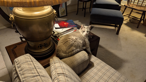 I thought he might sit beside me on the sofa, but he chose to stretch out on the piece of furniture to my left.