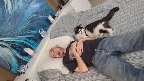 Lucky is a bit different. He will try to climb into my lap whenever I am in a chair, although he tends not to stay long unless that chair is the sofa in the media room, where he prefers to kind of drape himself across one leg.