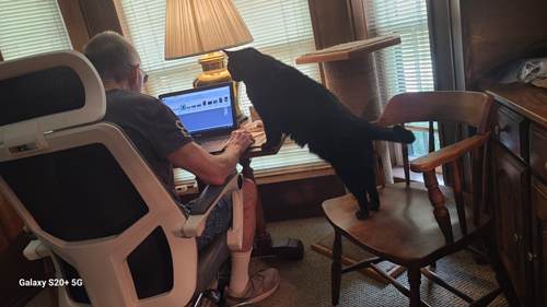 Cole is the most particular of all. The one time I can be sure that he will want to climb into my lap is when, as in the picture at left, I am seated in the office chair at my laptop in the study. There, it is something of a ritual, or a "dance" that has to go on to actually get to the point of his being in my lap.