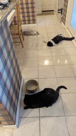 As it turns out, the cats seemed to love the scent of the bleach, for three of them came in after the bleach and dried and started rolling around on the floor as if bleach and catnip were the same thing. I didn't realize that this was a "thing" with cats, but it wasn't causing them any harm so I didn't try to shoo them away.
