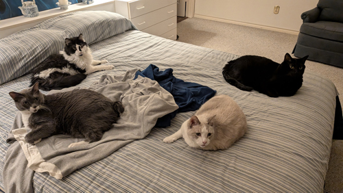 You've seen numerous pictures of the cats on my clothes, but it seems also true that the clothes can act like a magnet, drawing cats to them even if they aren't all right on top of them. That's what seemed to be happening today, allow me to get the rare picture of all four cats in the same place at the same time that doesn't involved getting fed: