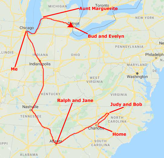 From Atlanta they planned to work their way north to Chicago to spend two days with me and then they would drive around the south end of Lake Michigan and up to Muskegon (my birthplace) to see my Dad's only sister, my Aunt Marguerite. From Muskegon, they would drive over to Chicago to visit my Dad's other brother Bud, and his wife Evelyn. After a visit there, they would head home to Charlotte.