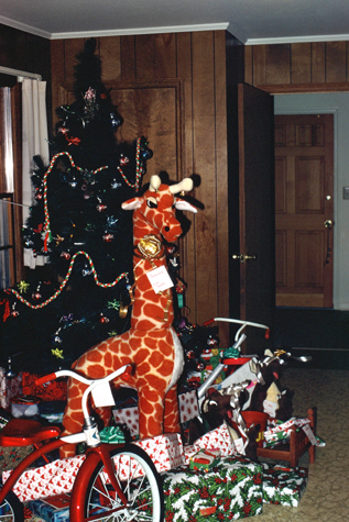 (Picture at left) Oh, it's great to be a kid at Christmastime. To get a tree up and decorated, to do all the shopping that's necessary to purchase all the gifts under the tree, all the time it takes to wrap them nicely so you can look at the for a few hours after Santa leaves them, and to prepare and serve the Christmas Dinner; all of that takes a great deal of time and effort. But when you are five and four (as Ted and Jennifer are), none of it is on your own to-do list. The tree is in the playroom; the laundry and back door are in the background.