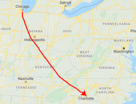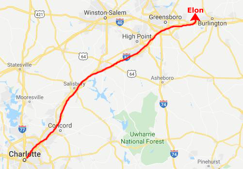 So just off the exit from the Interstate, you almost immediately have to double back on Garden Road which goes back along the north side of the Interstate and dead ends into South Williamson Avenue. Here, you turn right and head north, go across US Highway 70, continue north and eventually through the center of Elon, and finally, as you continue north/northwest, you will come onto Elon-Ossippie Road (where you reach a red line again) that leads to my sister's farm.