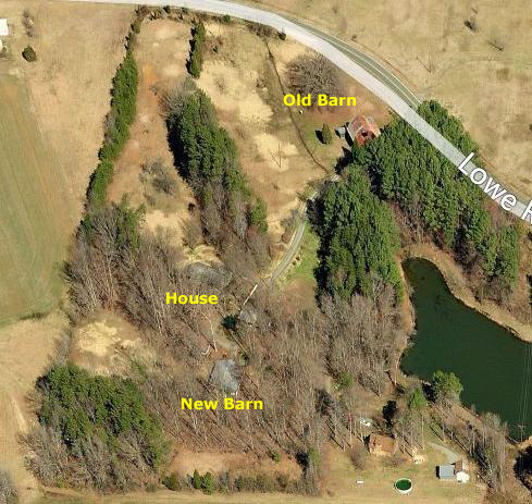 There's an aerial view of my sister's property at RIGHT, but of course it doesn't show the farm as it looked this year. The biggest change between then and now (as I write this) has been the construction of a new, modern, cement-floored barn up near the house, to take the place of the vintage dirt-floored old one. (I will visit here during its construction years from now, and I created an album page for the pictures we took of it under construction.)