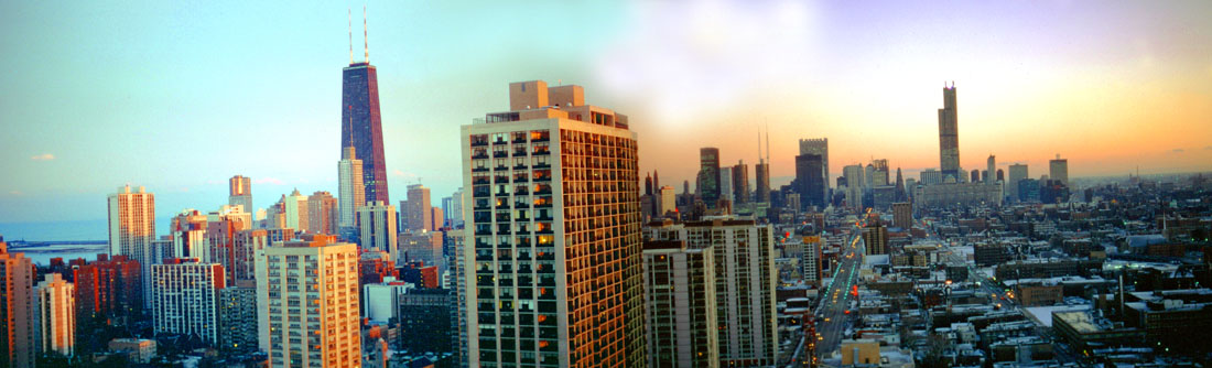 I noticed something about the daytime and nighttime pictures that I took of downtown; two of them seemed to overlay quite nicely, and so I decided to create a night-to-day transition. Below you'll see Chicago at night; just hover your mouse pointer on the image below and watch the sun come up: