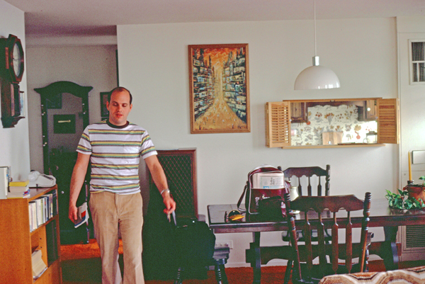And here is one of my best friends, Tony Hirsch. In this picture you can see some of the changes that I made to the apartment, particularly the removal of the door to the kitchen and its replacement with the passthrough. The dining table is still too large for the area, and I will have to consider doing something about that.