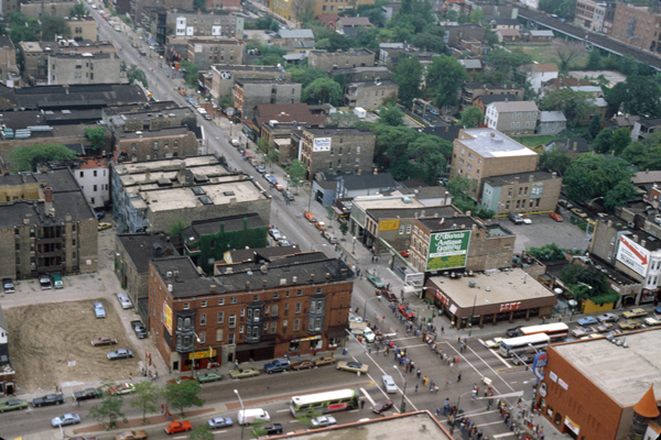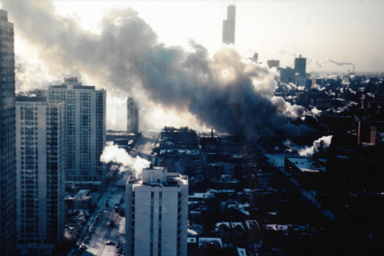 ![]() This view pans a bit to the west, and that's Wells Street running south towards downtown. You can see where the explosion was; a bit east of Cabrini Green and the Montgomery Ward building. |
