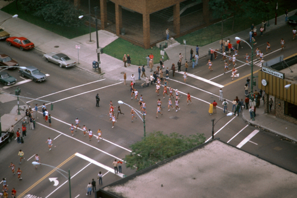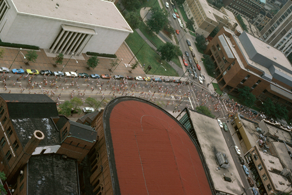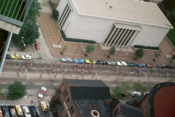 The Chicago Marathon is 26.2 miles long, of course. While the course has changed over the years, it currently starts in Grant Park on the lakefront downtown and winds through part of downtown before heading north on Clark Street. It passes a block east of the Parkview going north, and goes all the way north to Addison Boulevard.