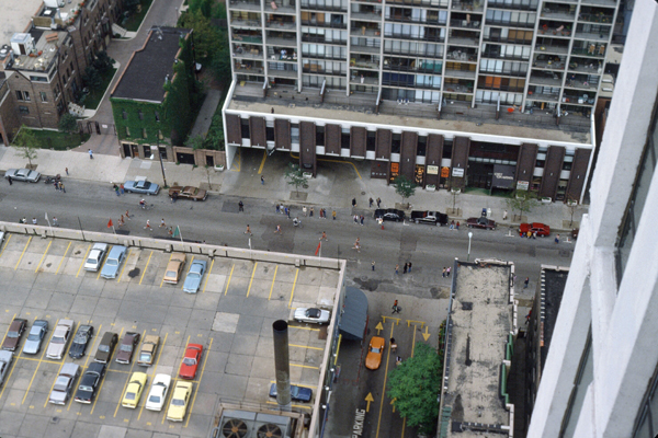 (Incidentally, in slide 8, you are looking down the side of my building to the runners on Wells Street. Across Wells Street is the Americana Towers, and I have a few friends that live there. On this side of the street, you can see the roof of the Treasure Island grocery store where I do most of my shopping. The parking garage for The Parkview can also be seen down below.