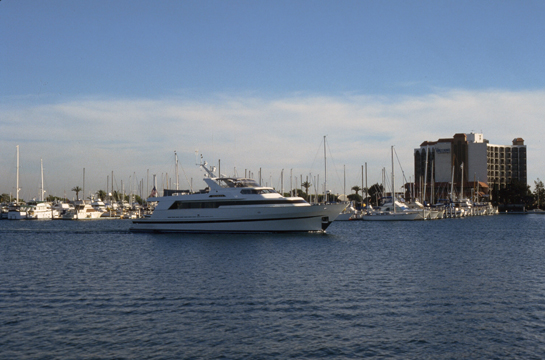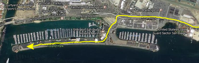 ![]() Here you can see some of the Harbor Island hotels and boats in the San Diego harbor. The Pacific Ocean is reached by taking the waterway around to the left in this picture. |