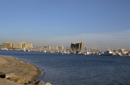 Harbor Island is artificial, built specifically for the marinas and hotels that have been constructed on it. It provides a location convenient to the airport, which itself was constructed on filled land. In the picture at left, you can see Grant sitting on the rocks on the south side of the island with downtown San Diego as a backdrop. This shot looks east across the north part of San Diego Bay.