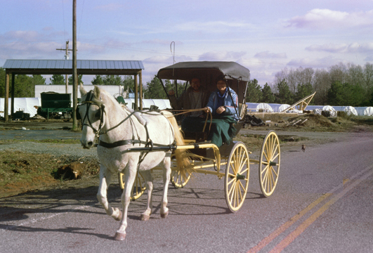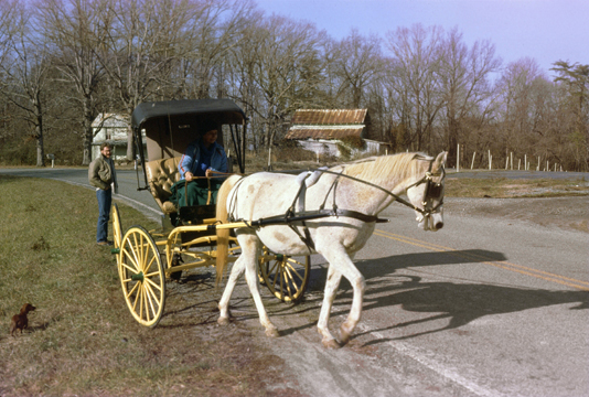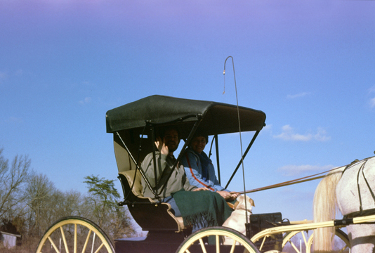 ![]() On Lowe Road in front of Judy's farm, she is driving a carriage and she and Bob have fixed up for one of the horses to pull. |