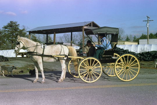 ![]() Here is Judy driving the carriage. That is Lowe road, right in front of their farm, and Hubert Lowe's nursery operation across the street. Grant is just getting in the carriage. |
