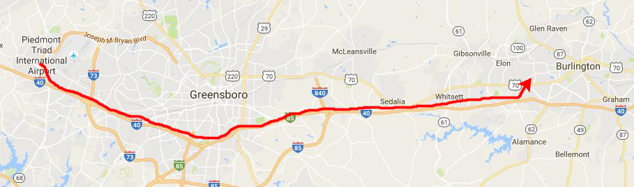 So just off the exit from the Interstate, you have to double back on Garden Road which actually goes northwest more towards Elon (blue route). It connects to South Williamson Avenue, which you take north, across US Highway 70, through the center of Elon and out to the north, eventually angling off to the northwest.