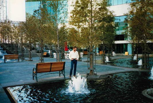 ![]() Here is Grant amid the fountains at Fountain Place. He is standing at the edge of one of the three or four pools that are on one side of the building. On nice days in the warm weather, this area is thronged with people on a normal business day, most of them eating their lunches in the sunshine by the fountains. |