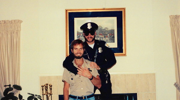 Before we actually went out this evening, I set up the tripod so I could take a picture of the two of us. Grant is still in his police uniform, and I am wearing a military shirt with rank and other insignia.