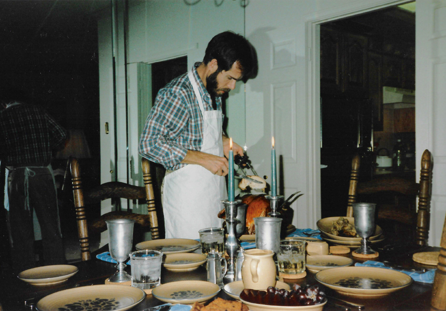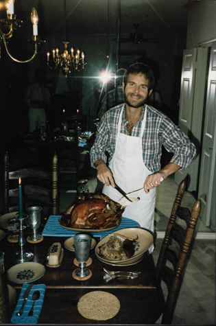 (Picture at left) Here I am slicing the turkey for Thanksgiving dinner. Greg is taking this shot, and you can barely see Grant also in the mirror. I have always enjoyed cooking turkeys at Thanksgiving- it is my trademark. Until I met Grant, though, I sometimes cooked them for myself only. Believe me, it is much nicer being part of a couple that can always do things together. As usual, Grant had decorated the table and the house to perfection.