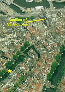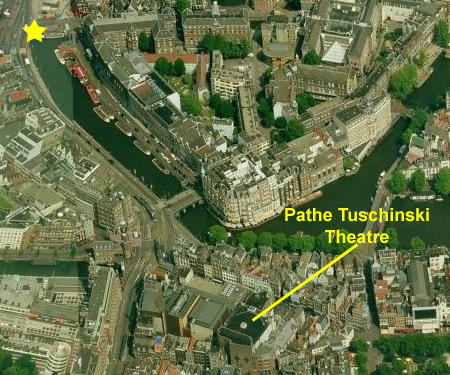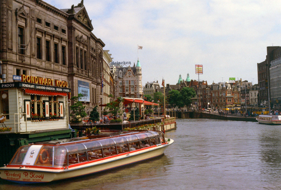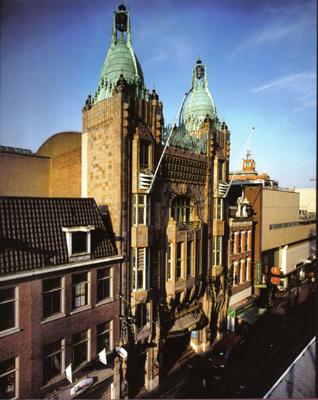 In my photograph, you might notice the tour boat agency at the left and in the distance two weathered copper-sheathed spires. I did not know it at the time, but while creating this page I was able to identify them as being atop the Pathé Tuschinski Theatre.