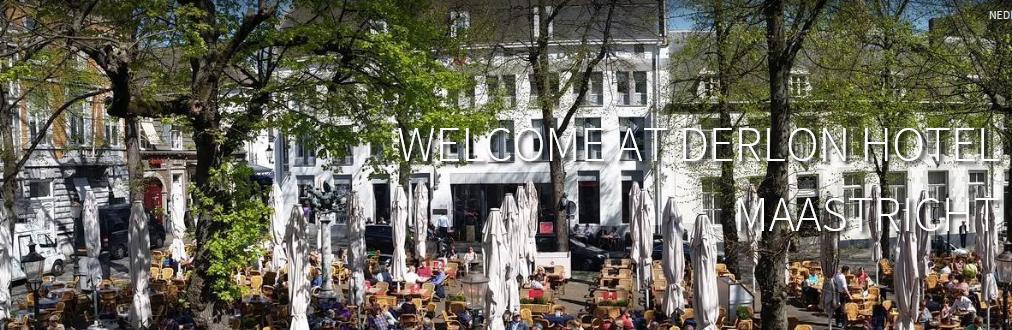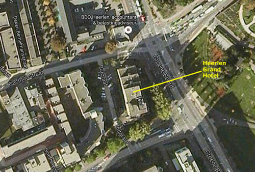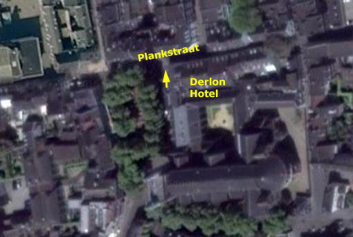 I think it's pretty amazing that you can see all the elements of the little extract above in the large photo above, left. The two commercial signs are still the same, almost 30 years later. Between them, you can see that the little white strip was, as I suspected, the name of the cross street- Plankstraat. Armed with that bit of information, I just used Google maps to locate the street in Maastricht. When I did, and when I zoomed in far enough, Google identified the building I was in front of as the Derlon Hotel. Not quite satisfied yet, I looked to see if the hotel had a website, and of course it did. Right there on its home page was a picture of the front of the hotel, taken from what was indeed a park right across the street: