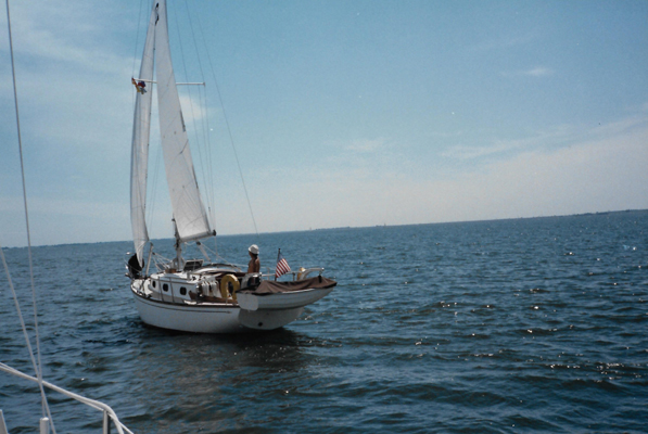 Anyway, both Grant and Richard like it, although Grant tells me privately that taking care of all the teak is going to be a real chore, and he is glad the S-2 doesn't have so much. Richard is dating a girl named Charlotte, who is very nice, and we are all out sailing together today. This is Richard's boat in a photograph that I took from aboard the S-2 as we sailed in tandem across the lake.