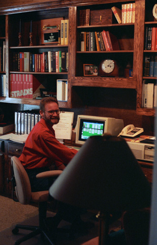 We decided not to go anywhere for Christmas, which we spent at home, having some friends over occasionally during and after Christmas. The picture at left was taken one December afternoon as we were waiting for our friend Bob to come over, and has Grant playing solitaire on the computer in the den.