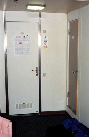 To the left is a longer hallway with staterooms on either side. There is a dressing room on the other side of the ship from here, which is accessible through a short passageway near our door, where you can use hair dryers and so on. They won't plug into the bathroom here, although shavers will. (I learned later that the Costa Riviera is an older ship, and all the newer ones have regular electric systems that allow you to bring your own small appliances. Actually, most of the newer ships come equipped with hair dryers at least- like most hotels.)