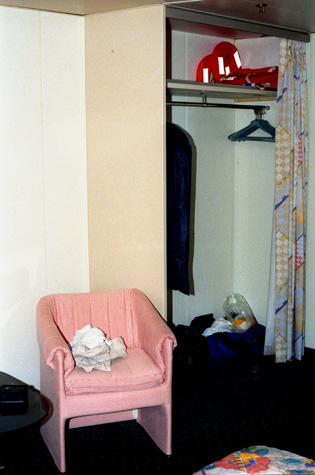 (Picture at left) The closet is just to the left of the door. Our life vests are there (we have already had one drill and will have another sometime during the cruise) and space for all our bags and clothes. To the left of the closet is one of two chairs in the room and a small coffee table (which doesn't show up in this picture or the next).