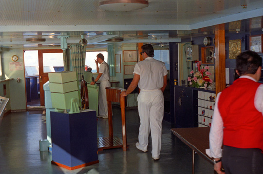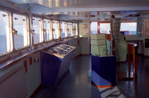 This is the forward part of the bridge on the Costa Riviera. There is a ship's wheel, right in front of that curved wooden backrest, but there was never anybody there. I deduced that the ship must have an autopilot and we must be on it. I thought about asking someone, but I didn't want to embarrass myself in front of Grant.