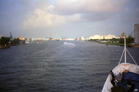 ![]() Approaching Out Dock in Fort Lauderdale Our ship will be going around to the far side of the point that you can see ahead, to dock at the same place from which we left. The day was already getting warm. |