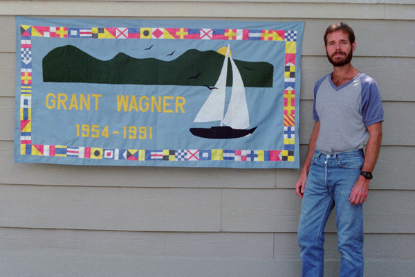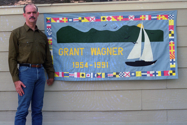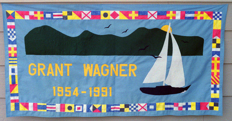 Beginning early this summer, we spent some time designing what we wanted and getting just the right materials for it. Then we spent a number of weeks cutting out the patterns for the boat, the birds, the hills and the letters. I took strips of sailcloth and hand-painted the nautical flags to spell out a message from Larry and I to Grant around the border of the scene. Once we had everything cut out, then we began to sew it all together. The whole project took about three months, what with Larry's work schedule and my own, but the result was something of which I think Grant would have been proud: