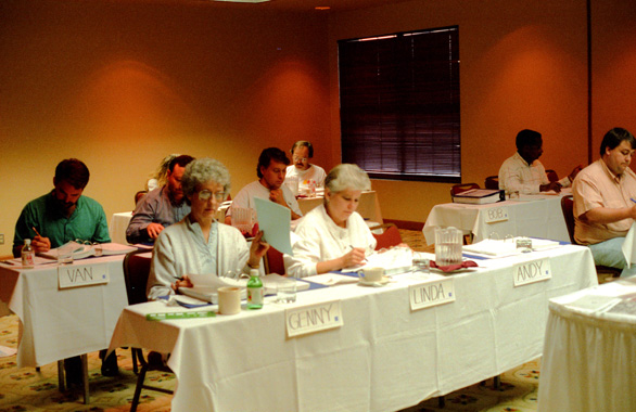 It was the second guy from the right that prompted both these pictures. I usually don't have many attractive people (of either sex) in my classes, but he was an exception; he had all the right qualities. Some discrete inquiries revealed that this guy was one of the models for the company's catalog; they had a series of them, all employees and of both sexes, that were "perfect" sizes for the clothes they manufactured, and so they saved money by using them as models rather than expensive professionals. An interesting concept, and they couldn't have picked a better size 32. Sadly, conversations during the week revealed him to be married with children.