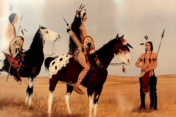 What makes it interesting, although you can't make it out in the photo at left, is that there is the faint images of an oil derrick sticking up through the clouds above the standing Indian. It is meant to contrast the rugged simplicity of the lives of Native Americans and the complexity of today's technological society.