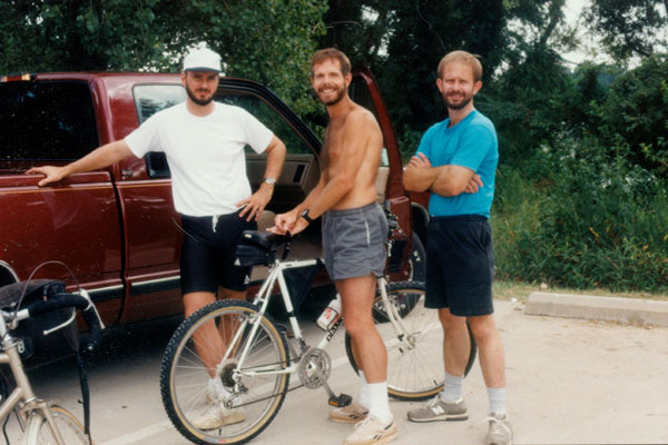 After we got the bikes unloaded and were about to set off on our ride around the lake, Fred set up his tripod and took a couple of pictures of us. This is the best of the two or three pictures that Fred took of Mike Racke, myself, and himself getting ready for our bike ride at White Rock Lake in Dallas.