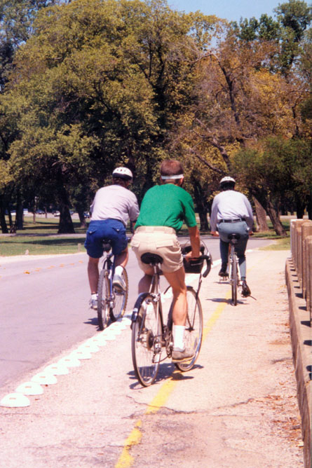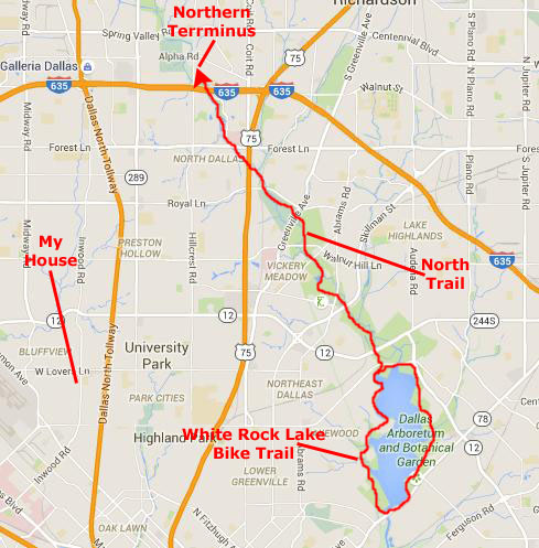 In 1997, there were plans to create another bike trail nearer to downtown using the right-of-way of the old KATY railroad tracks (long since torn up). I can report from 2015 that this has been done; now the KATY Trail runs from the American Airlines Center south of downtown (not constructed for another four years) north along the railroad right-of-way to end near the intersection of Mockingbird Lane and Central Expressway. As of 2015, there are plans to build a bicycle/pedestrian bridge over the expressway at that point and then dedicated bike lanes all the way to White Rock Lake. We look forward to the completion of that project. A round-trip from the American Airlines Center to White Rock Lake, around the Lake and then north to the terminus at Alpha Road and Hillcrest will be somewhat over 40 miles!.