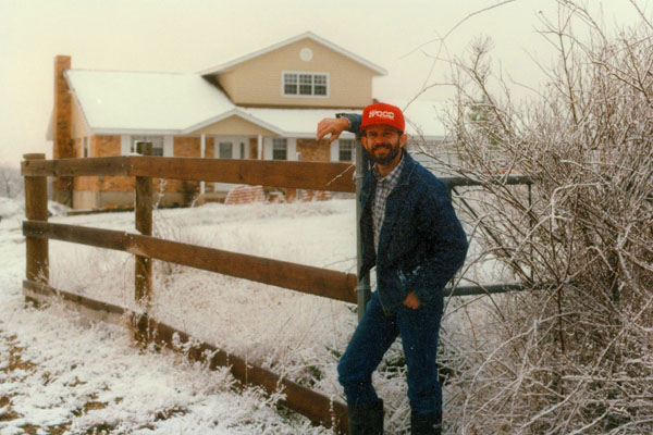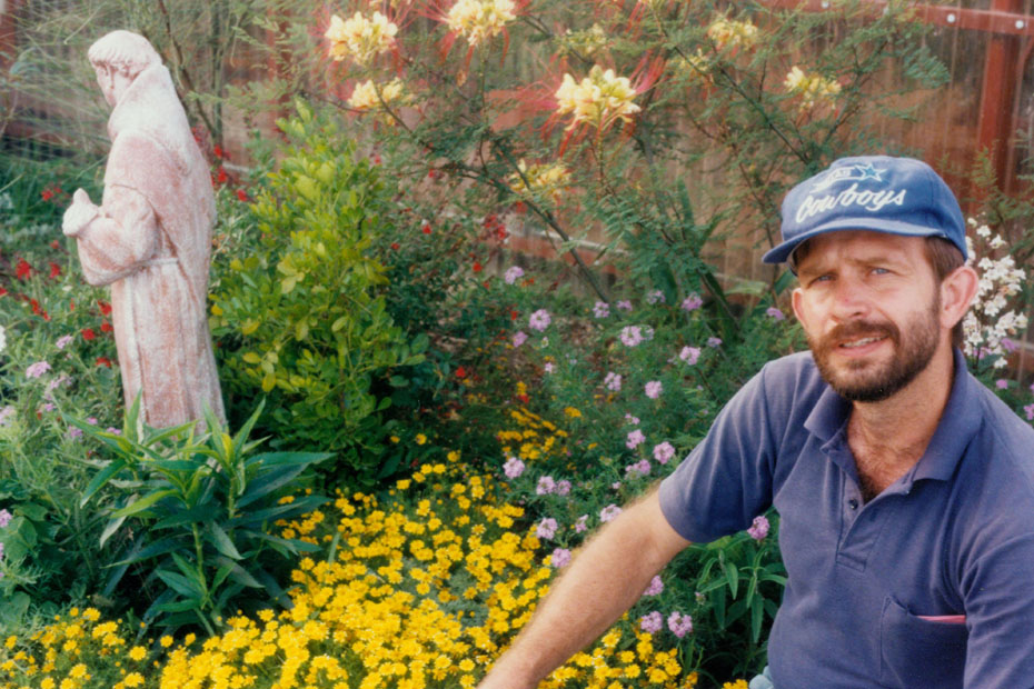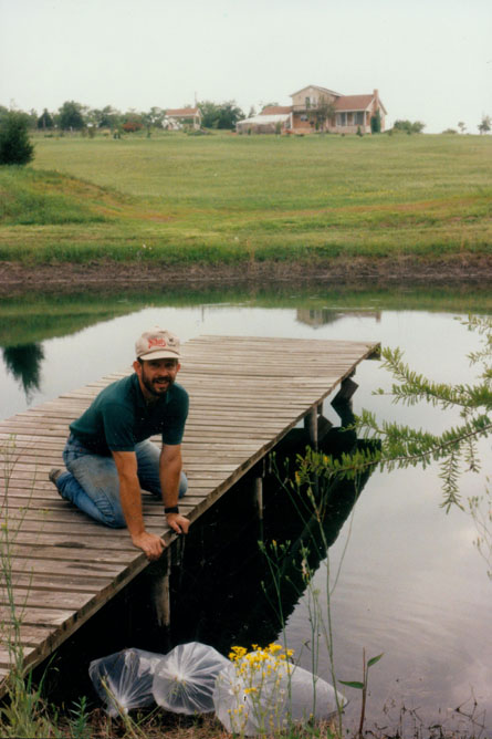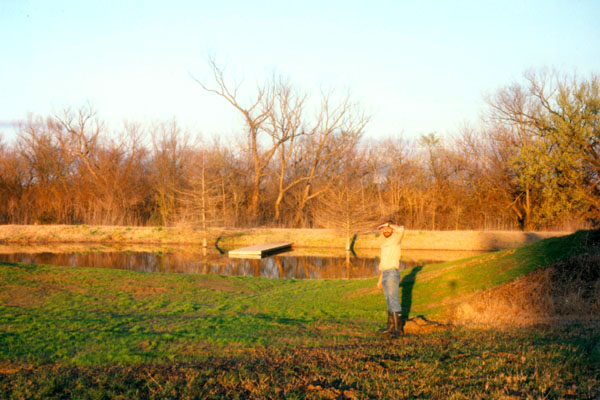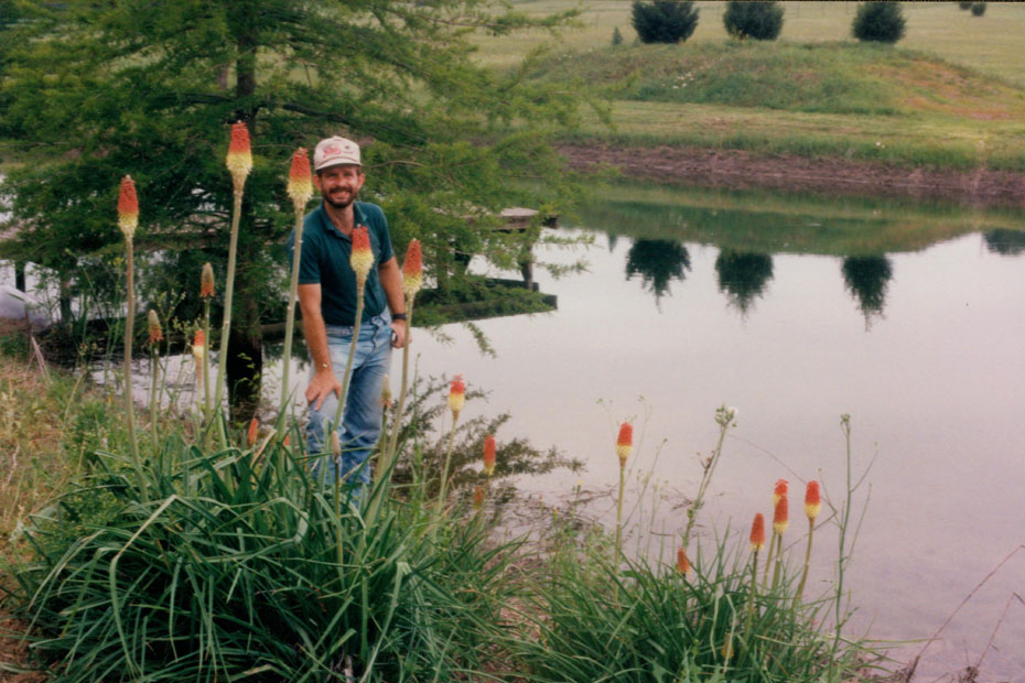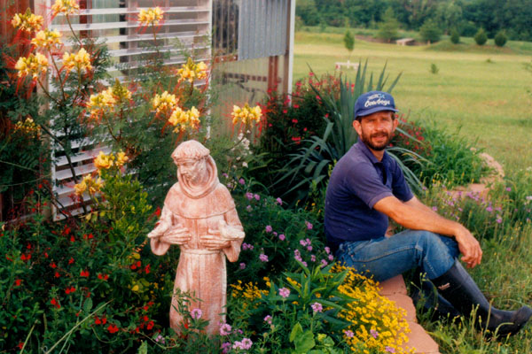 Fred has been busy building raised gardens around his house using the Windsor Stone that you see here to make walls that are level for the plantings behind them. He is also fond of garden statuary, and had taken a plain statue of St. Francis that we found near Weatherford, and painted and stained it for the garden. That's him at left, sitting on one of the low walls he has built. Way behind him down the hill you can see the pond and dock. In that picture, Fred is about to release some new catfish into the pond. This is a good view showing the expanse of Fred’s property, and looks west. You can see the extent of the pasture and the greenhouse addition at the left of the house and the gazebo up on the hill just south of the house.