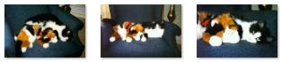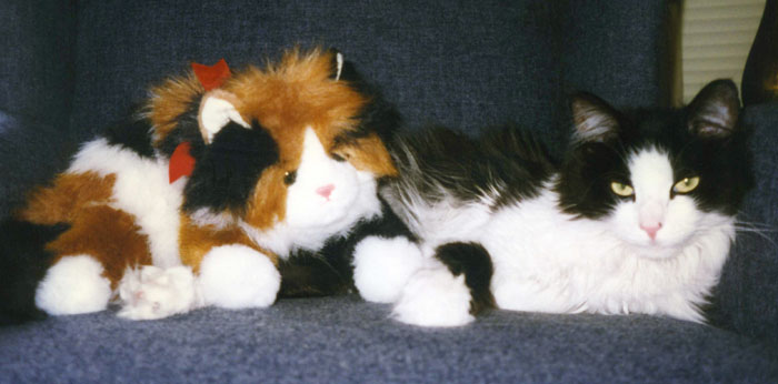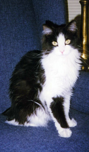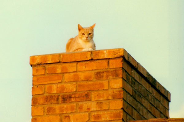 Tanner just showed up one day at Fred's house. He stayed in the bushes by the front porch and while Fred could feed him, he couldn't get close. Not until he brought Calcitinas out on the porch; at which point Tanner came up to sniff at her and rub noses, at which point Fred could latch onto him. He brought Tanner in, fed him and let him play with Calcitinas, and that was about all it took to domesticate him. Tanner is growing into a wonderful cat. He is extremely friendly and active, usually giving Calcitinas fits. He also likes to get out, and can often be found perched up on the chimney.