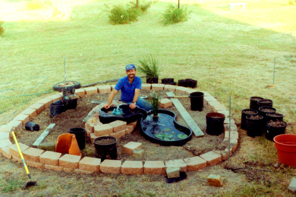 In the picture at left that I took from up on the porch at the back of the house, you can see that he has run an electric line from the house to power the pump. Eventually, this line will be buried so that he can mow over it outside the garden. One of the things that I like about Fred is that projects like this don’t faze him at all. I’d be overwhelmed.