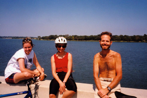 In the afternoon, two of the girls on the team- Jenny and Carol- rode with Jeffie and I around the lake, stopping at one point so Carol could take a picture of the other three of us on the dam at the south end of the lake; you can see that picture at left. It was a beautiful afternoon, but quite hot. Both of the girls had brought summer clothes, so they were prepared, and everyone but Jeffie and I had a rented helmet on. We had a longer ride with the two girls as we also rode part of the trail that goes north.