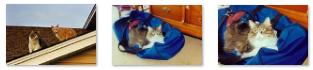 In addition to that picture, we took some of Tanner and Calcitinas. Fred took one that shows them both up on the roof (they have become fast friends and usually go out and come in together) and I took two more of Calcitinas snuggled into my duffel bag up in his master bedroom. There are clickable thumbnails below for these three pictures: