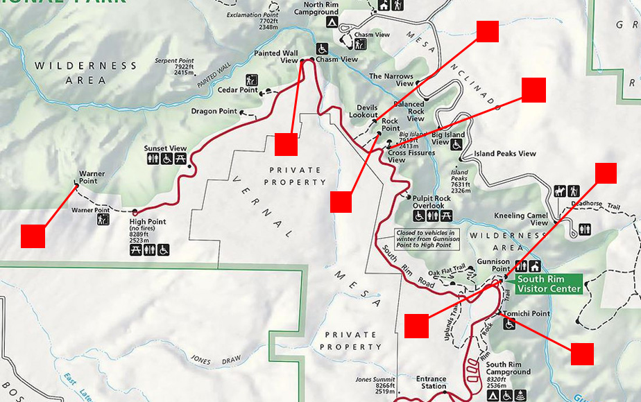 After we broke camp in the morning, we headed north towards the Visitor Center, stopping there before continuing on all the way to Warner Point at the north end of the road. On the way, we stopped at just about every overlook and viewpoint, taking pictures at many of them. So that you can follow along with us, I have noted on the park map below where we stopped for a picture (the red squares). To see the picture we took at that spot, just click on the red square connected to it.