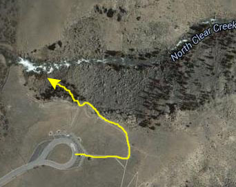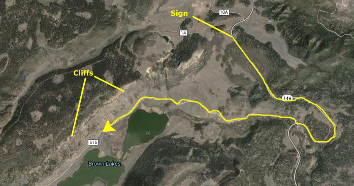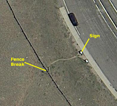 Take a look at the picture of me, and notice that there was a vee-shaped pass-through in the stock fence behind me in the picture (stock can't figure out how to get through the opening, but of course people can). Now look at the aerial view. In case you might miss it, I've marked that exact same fence break. Now, we were here in 1998- sixteen years before I am writing this. But the fence is, apparently, exactly the same now as it was then (Google aerial views are typically no more than a few years old).