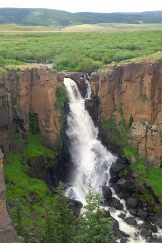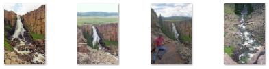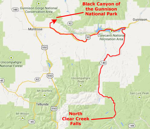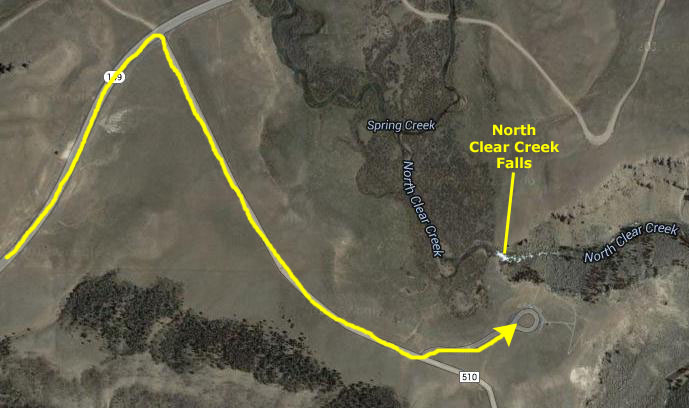 North Clear Creek Falls is an impressive drop of a little over 100 feet and is believed to be the most photographed waterfall in Colorado. There's a viewing area from which you can see it, and if you want, there's a little trail you can follow along the edge of the canyon. It gives you different viewpoints of the falls. You can also climb out on to the rocks of the west face of the little canyon, and you can get right up close , but it's a pretty long ways down, so we had to be careful to watch our step. This waterfall is considered to be the most photographed of all waterfalls in Colorado, but you need to be careful when you're taking pictures because some of the rocks can be slick.