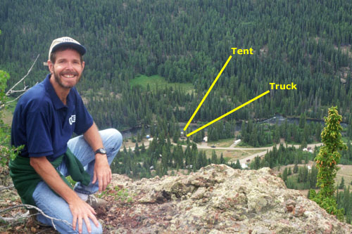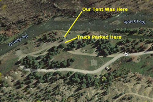 I just thought it was immensely interesting to compare the picture we took in July, 1998, with the aerial view that was taken sometime around 2010. One thing you notice is that many of the trees in our picture are missing in the aerial view. Indeed, there was a fire in this area between the time we visited and now, and I presume that is why many of the trees, both around the campsites and across the river to the south, are gone.